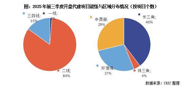 从2025年新开盘的代建项目分布情况看,在能级分布方面,二线城市是当仁不让的主力,84%的代建项目位于二线城市V交易网,15%位于三四线城市,仅有1%位于一线城市;在区域分布方面,长三角占比遥遥领先,占比高达40%。